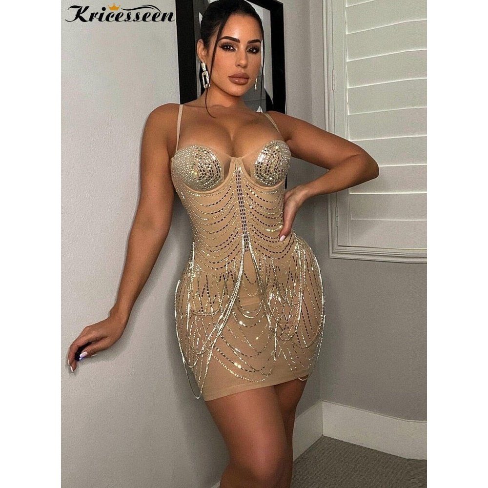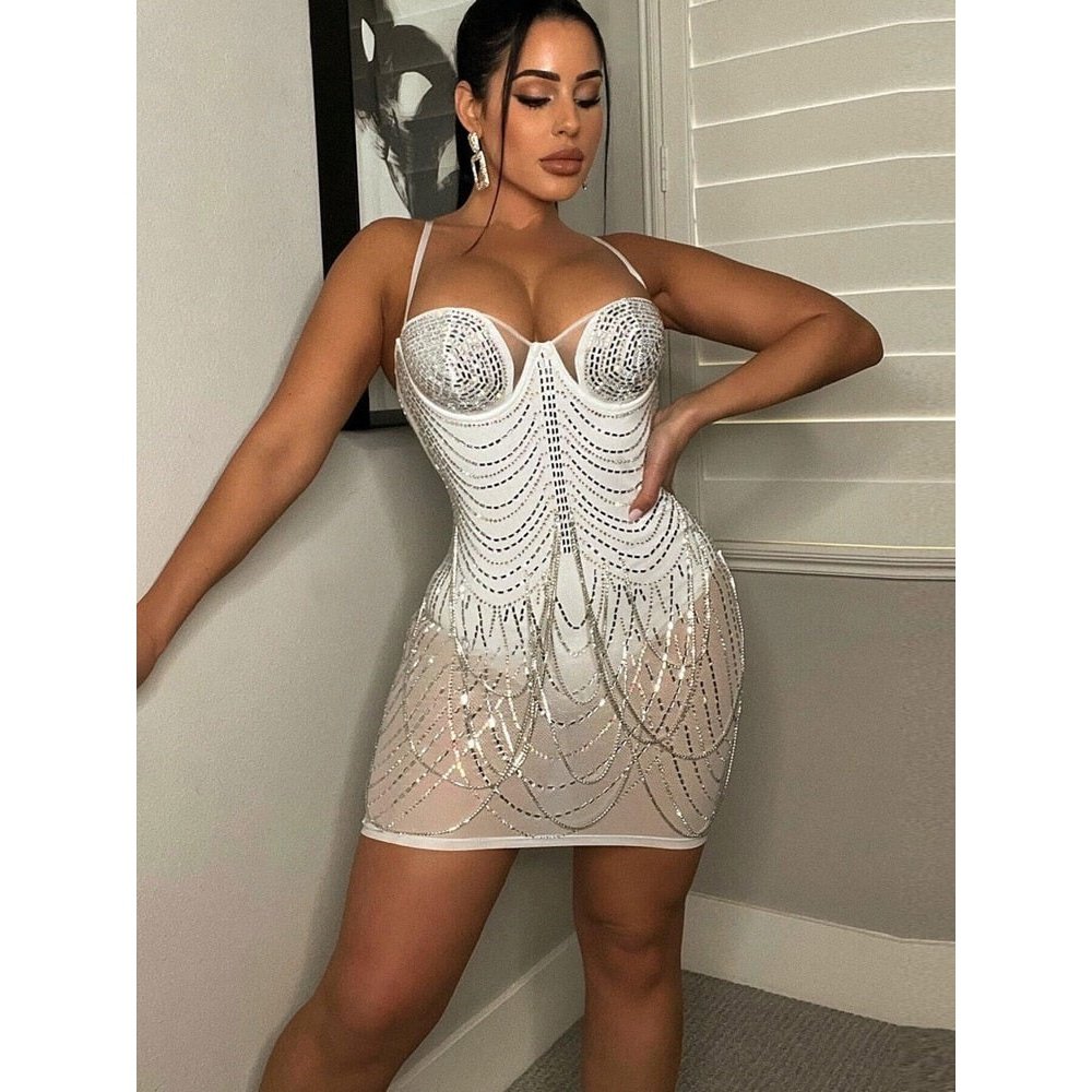 Chic Rhinestone Tassel Mini Dress - Women's Sexy Strap Bodycon Clubwear