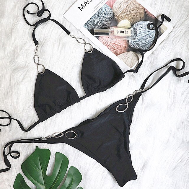Unleash your inner allure with our Sexy Halter Crystal Diamond Bikini. This stunning two-piece swimwear set is designed to make you feel confident, glamorous, and ready to make a splash.