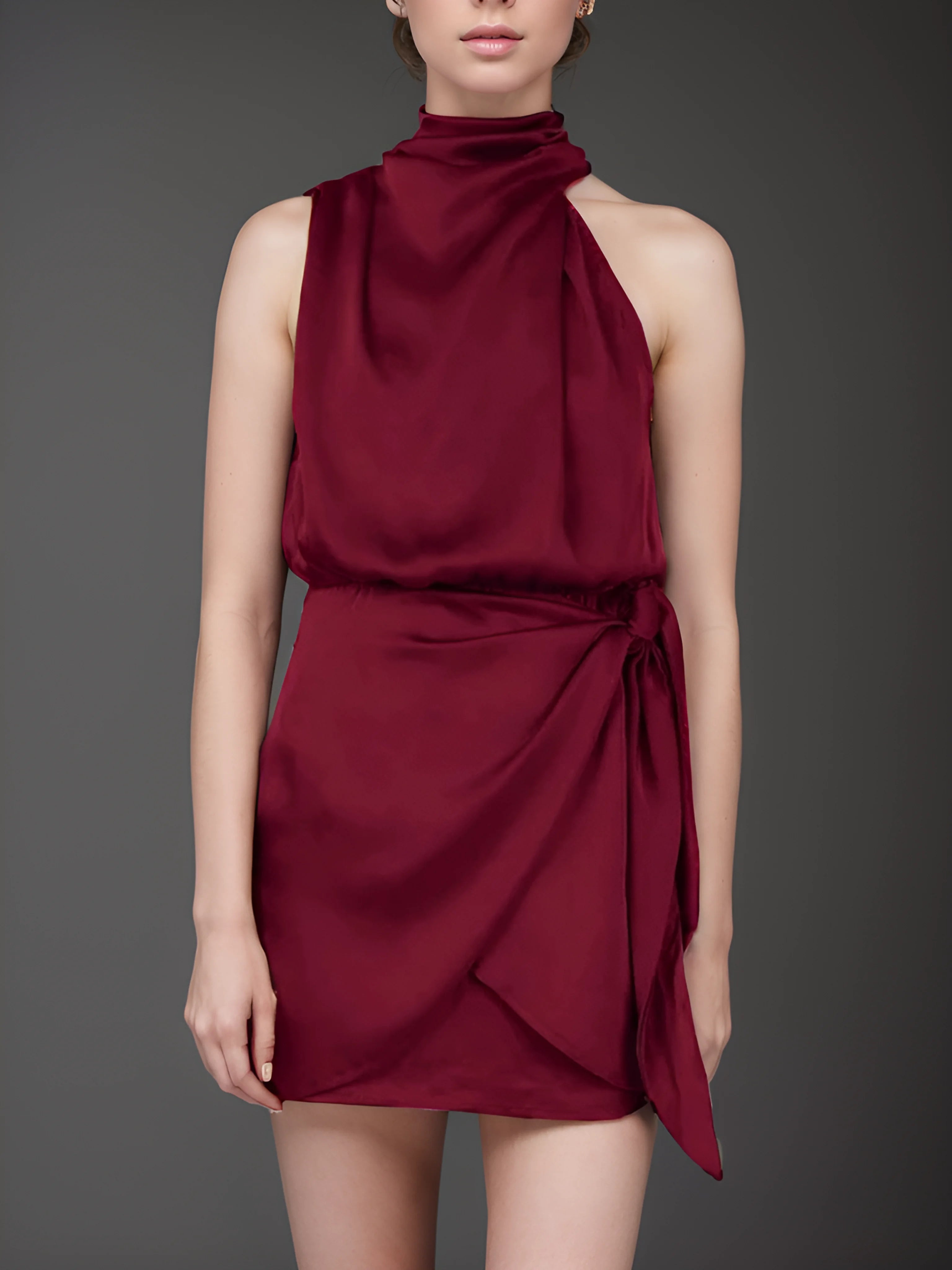Elevate your summer wardrobe with this Elegant Satin Sleeveless Halter Dress. Crafted from luxurious satin, this slim-fit, asymmetrical mini dress features a halter neckline and a zipper closure for a chic, sophisticated look. Perfect for parties and evening events, it comes in a variety of stunning colors including black, dark green, lake blue, rosy, apricot, light blue, and wine red.