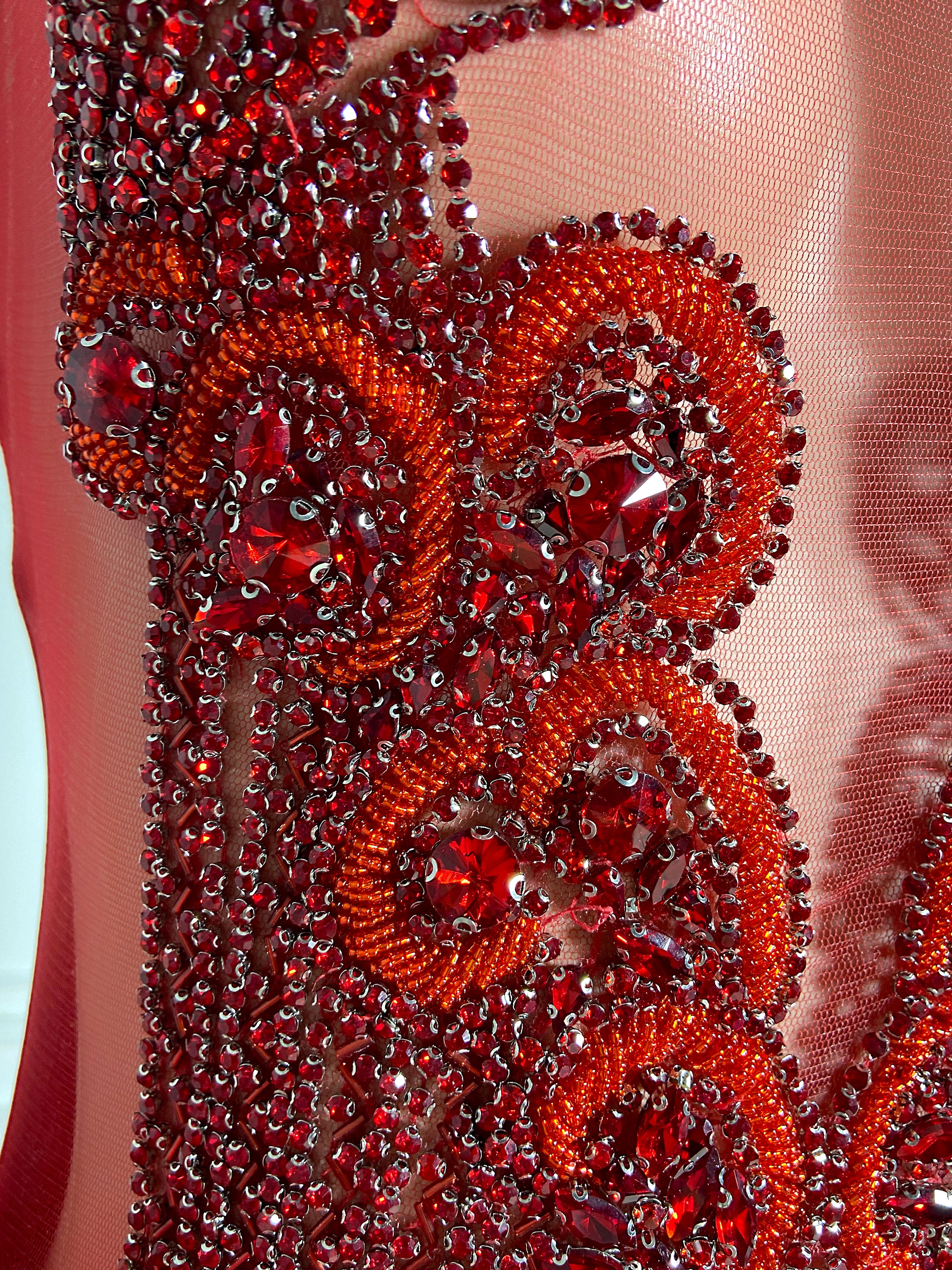 π Mesmerizing Design: This mesmerizing gown is a masterpiece of design, adorned with intricate beaded crystals that catch the light and create a dazzling display.