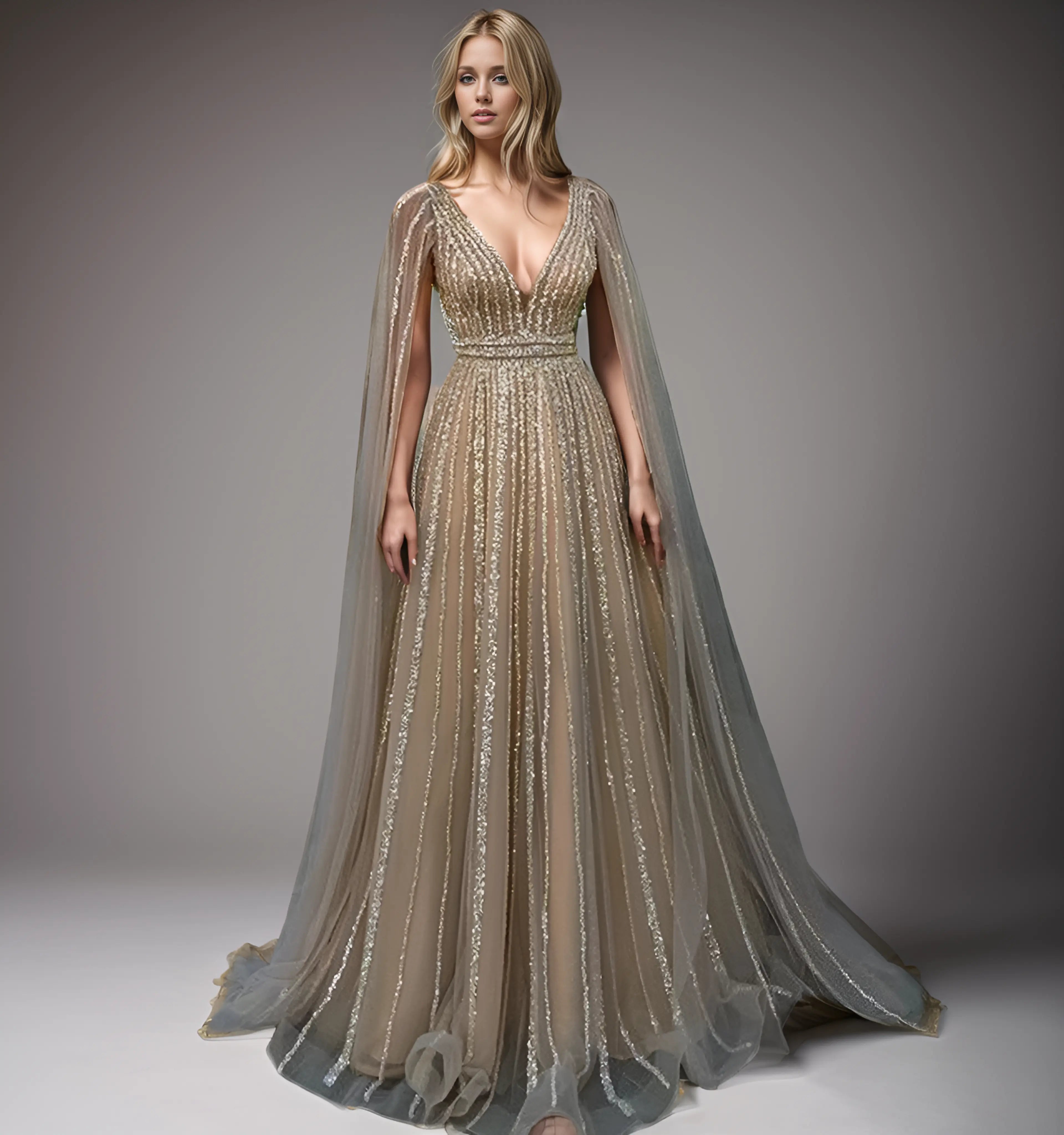 Evening Gown, a true embodiment of glamour and sophistication. This exquisite dress is adorned with sparkling beads, designed to make you shine at any special event. Its alluring V-neck adds a touch of elegance, while the champagne color exudes charm and luxury.
