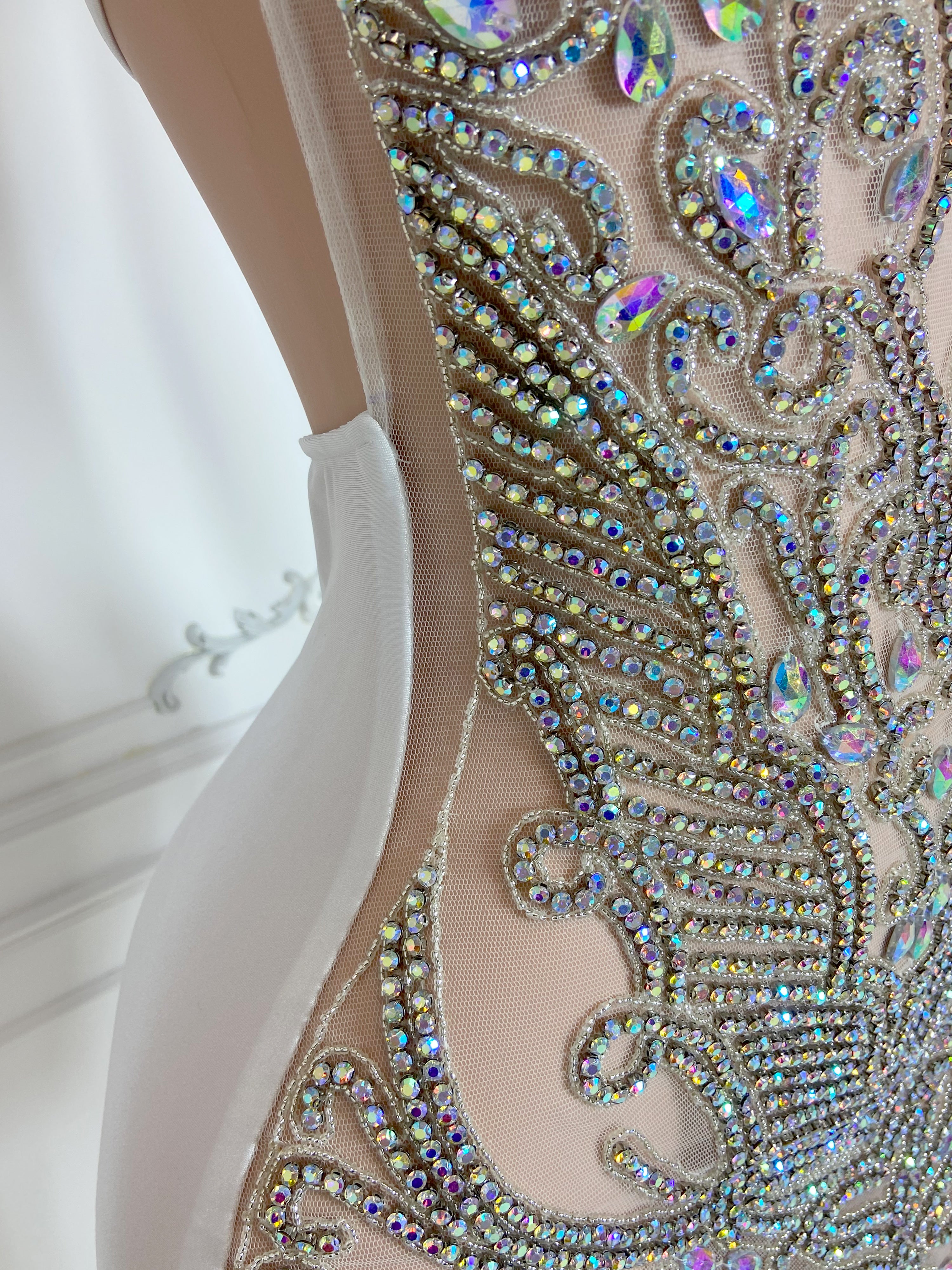 Elevate your style with our Gold See-Through and Rhinestone Long Sleeve Mini Dress, a captivating blend of opulence and allure. This dress is a masterpiece designed for those who appreciate the finer details of fashion. The sheer gold fabric gracefully reveals, adding a touch of sensuality while maintaining an air of sophistication. Adorned with intricate rhinestones, the long sleeves sparkle with every movement, creating a mesmerizing effect that commands attention.