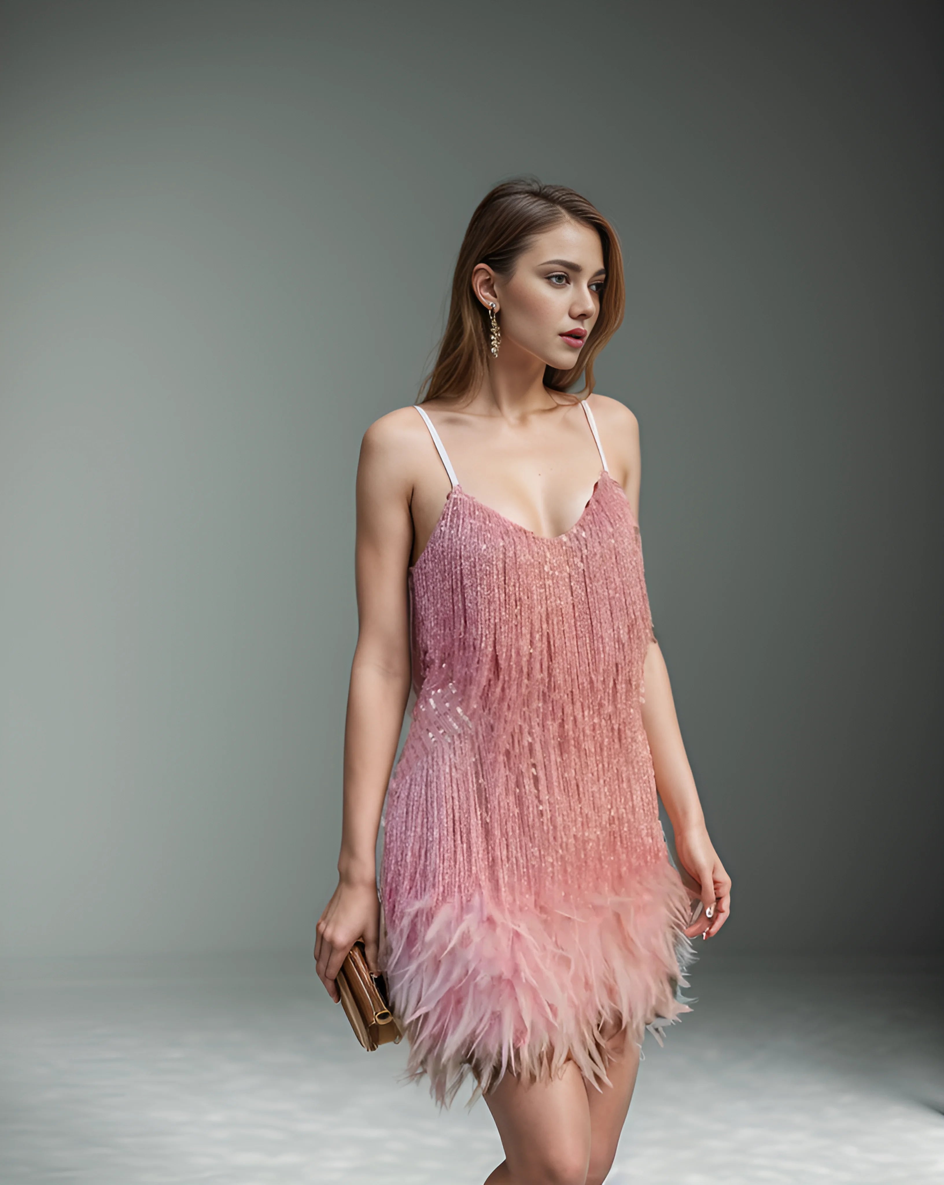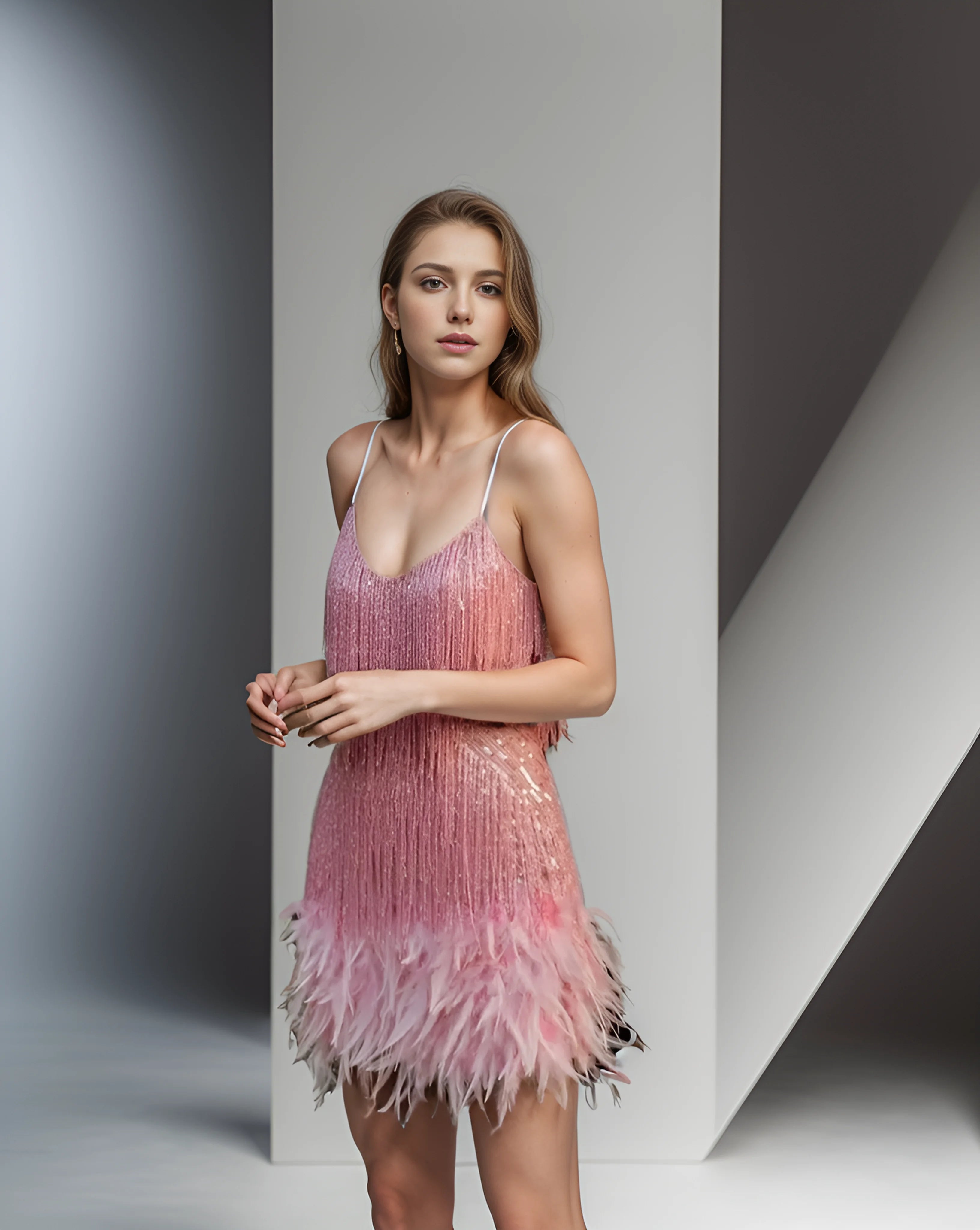 Gold Sequin Tassel Feather Mini Dress - Elegant Evening Party Wear