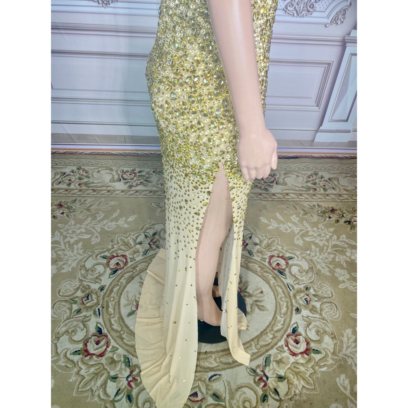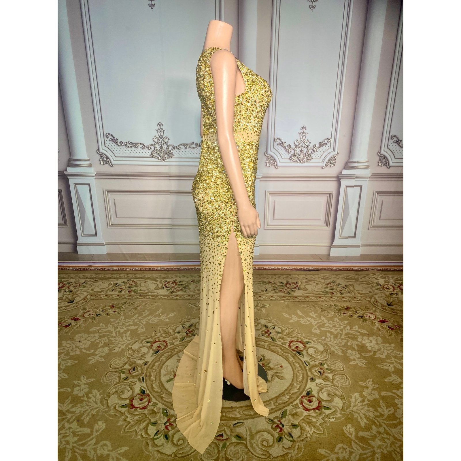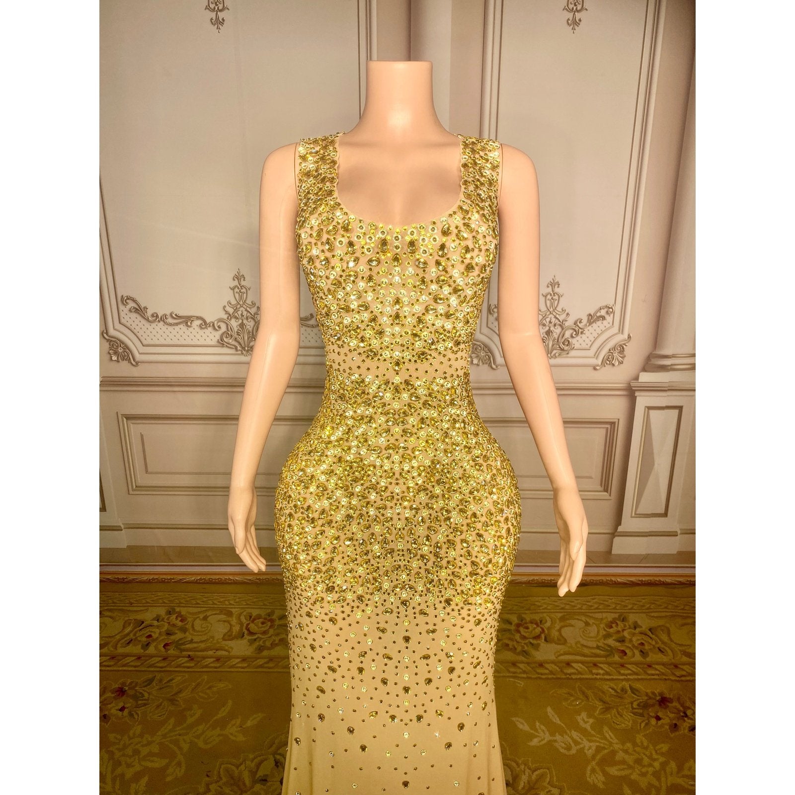 Indulge in the allure of timeless elegance and radiate an aura of sheer magnificence with our "Golden Glamour: Handmade Crystal Dress." Let it be the centerpiece of your ensemble and a symbol of your unapologetic commitment to embracing life's most exquisite pleasures.
