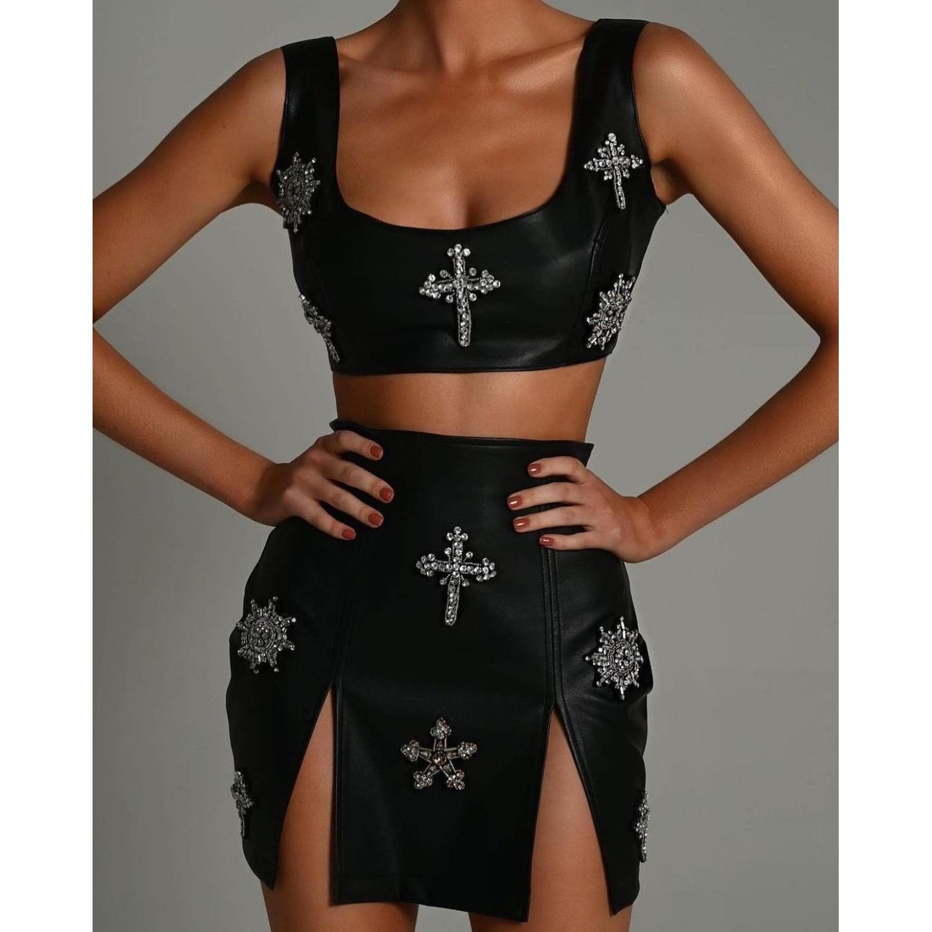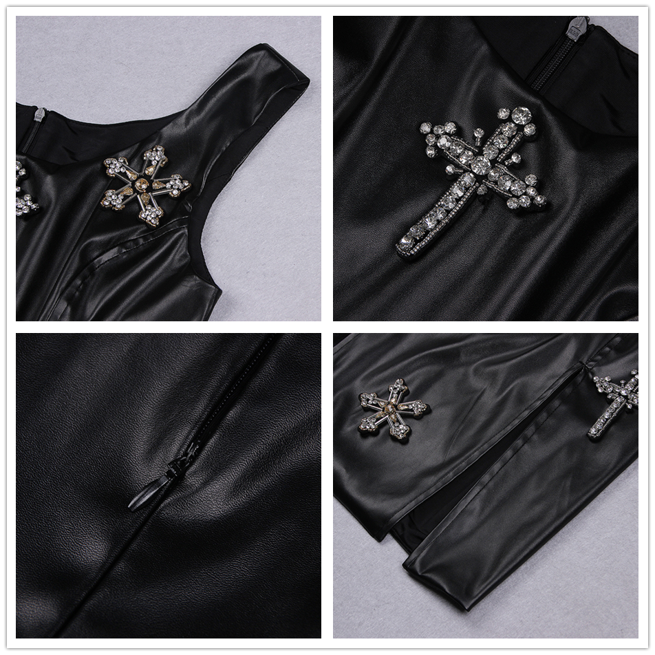 High-Quality PU Leather Diamond Bodycon Mini Dress - Spring-Summer Fashion
