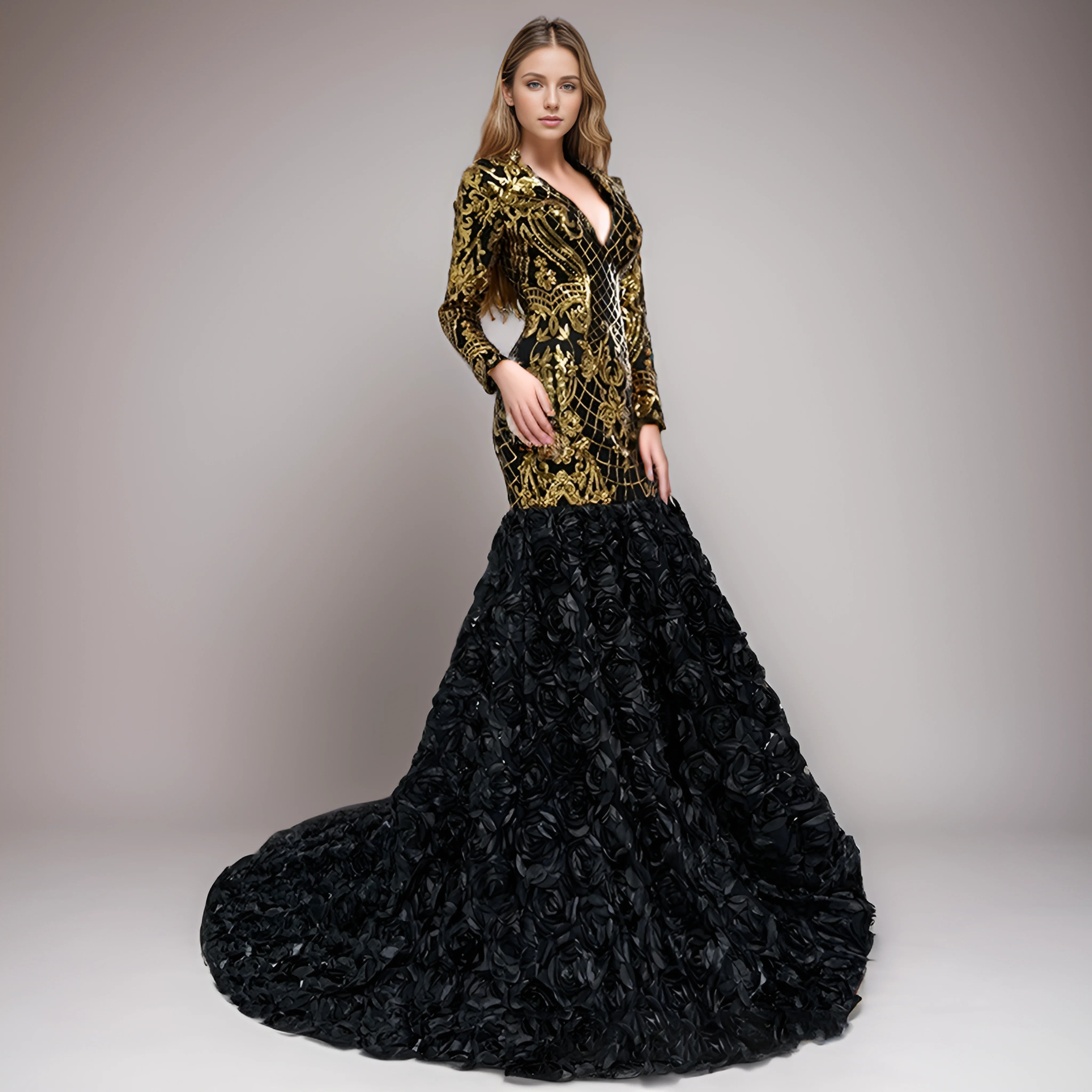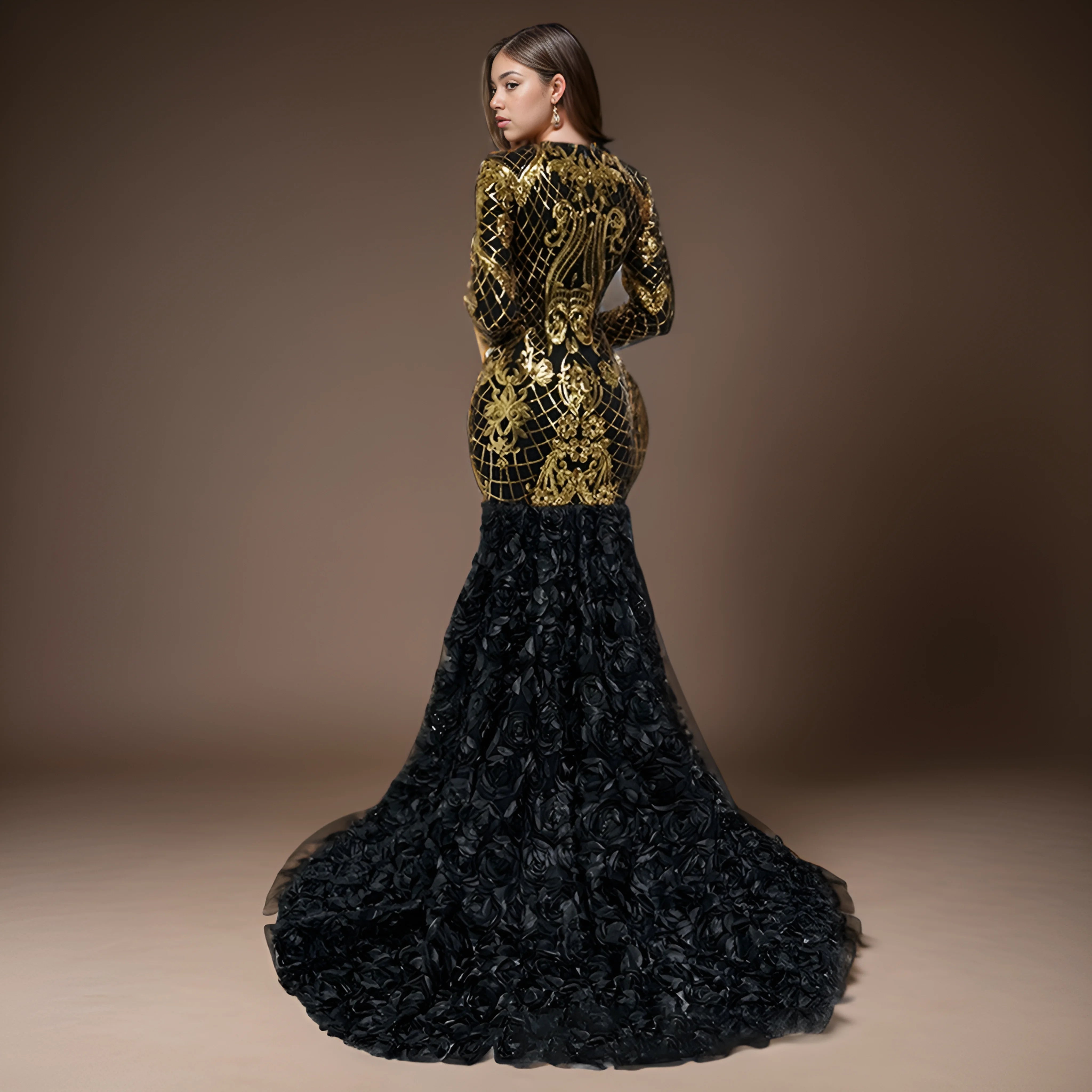 Luxury Black V-Neck Mermaid Evening Gown with 3D Lace, Sequins, and Long Sleeves for Women - Perfect for Special Occasions