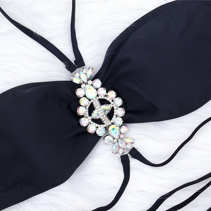 Luxury Rhinestone Halter Tankini - Black Push-Up Bikini Set for Women's Swimwear