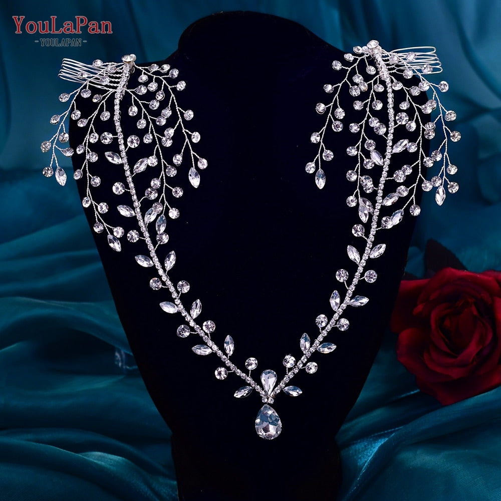 Rhinestone Bridal Forehead Headband with Combs - Wedding Tiara