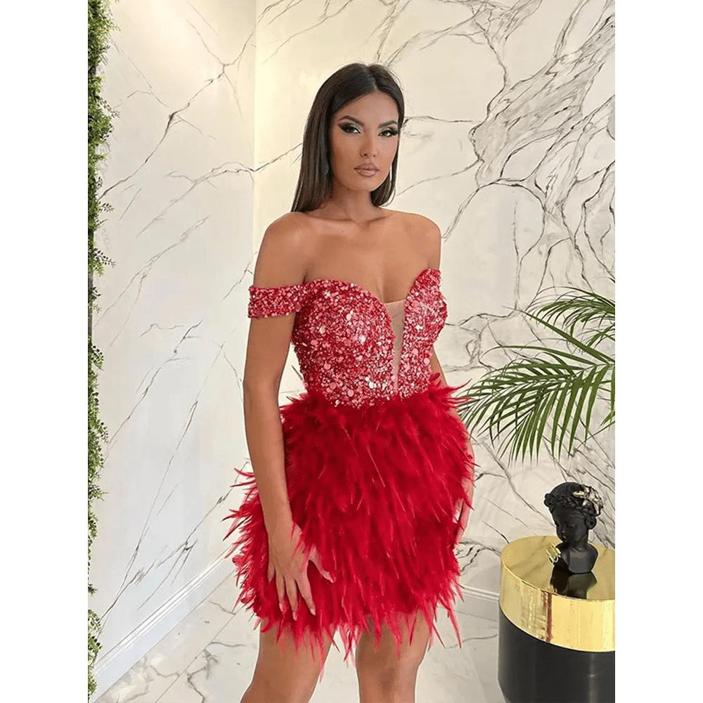 Sequin Feathers Mini Skirt Dress, the epitome of glamour and luxury. This stunning dress is designed for the modern and confident woman who wants to turn heads at any event. The off-shoulder neckline adds a touch of sensuality, while the mini skirt length and feather detailing bring a playful element to the design.