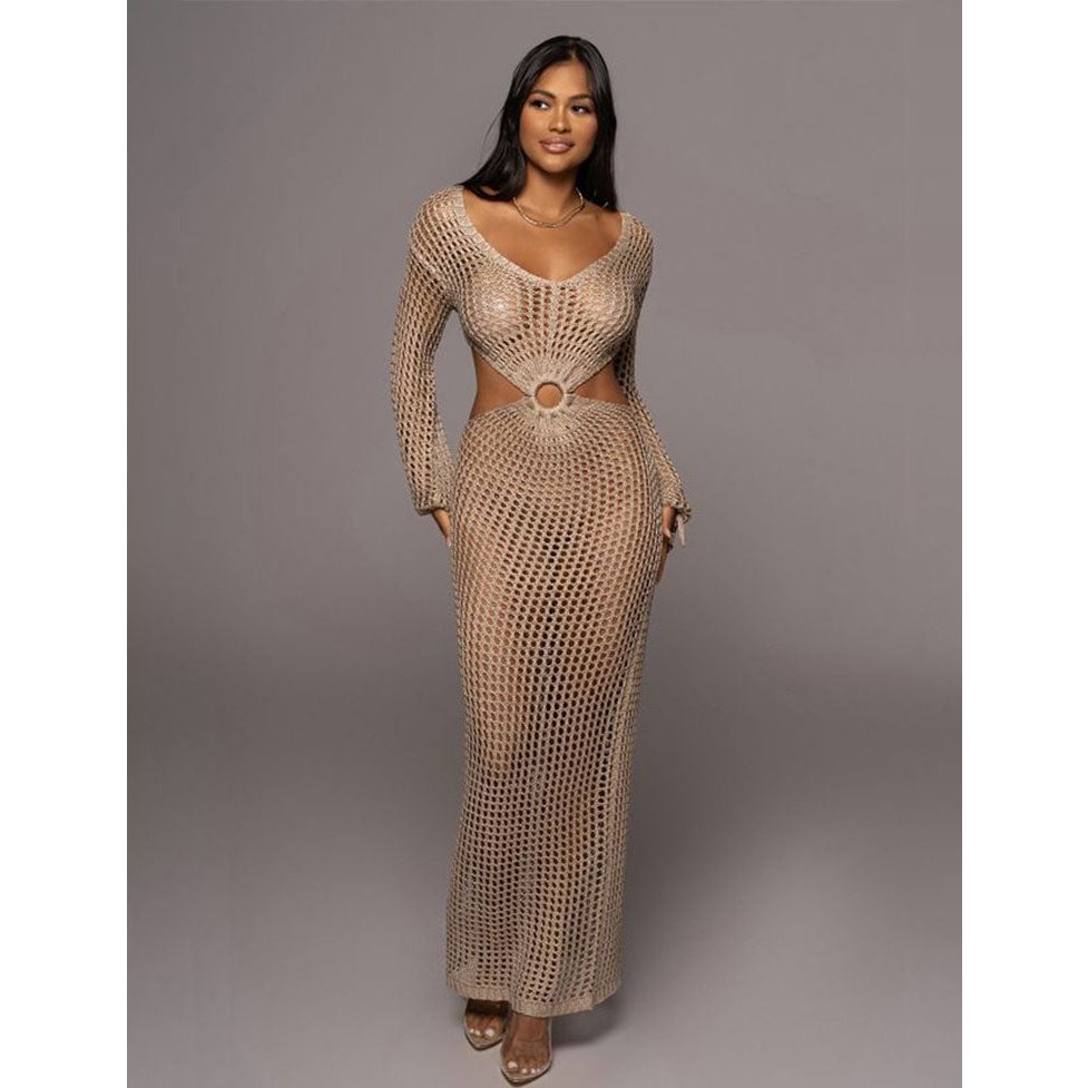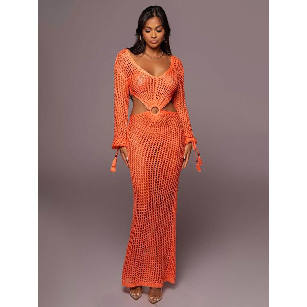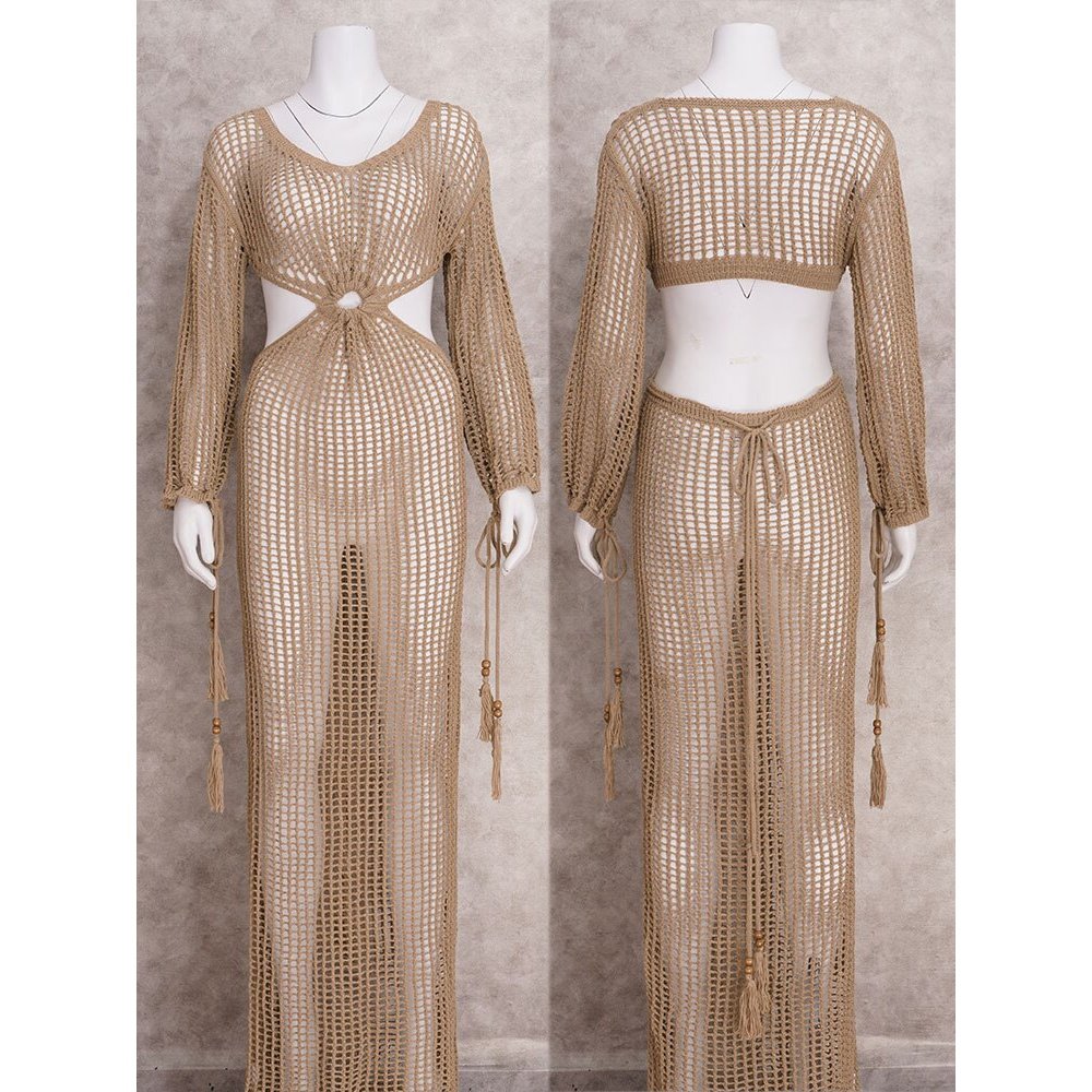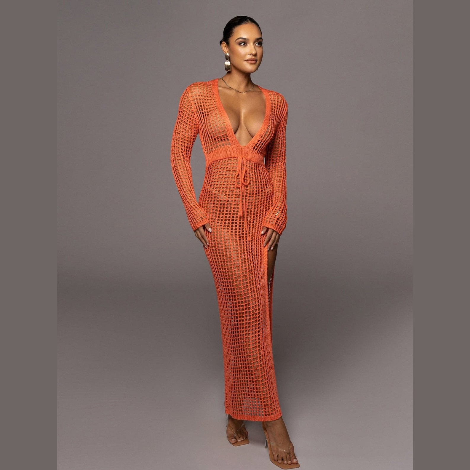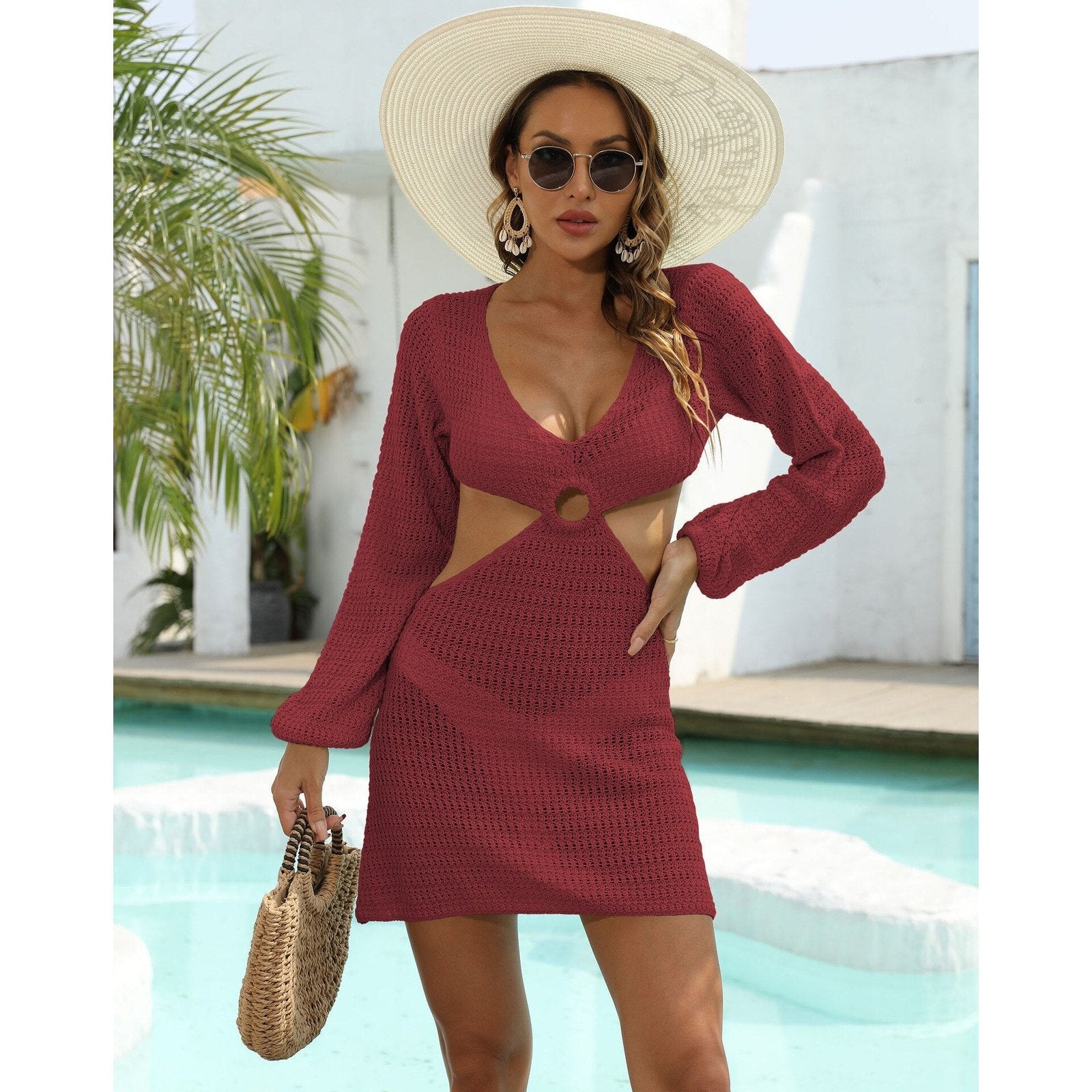Sexy Knit Mesh Swimsuit Cover-up - Deep V Neck, Long-Sleeve, Lace-Up Fringe Tunic
