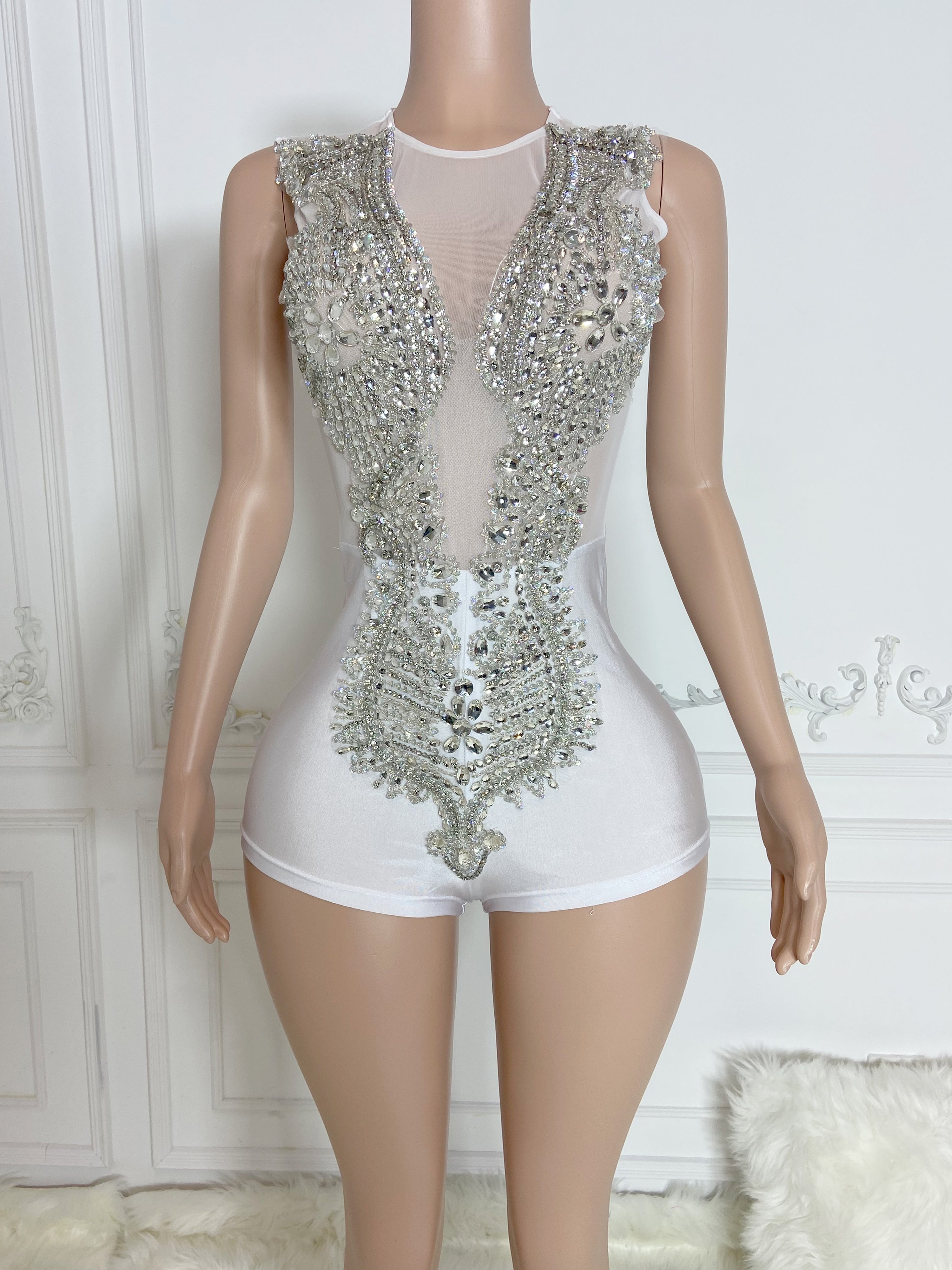 Silver Splendor - Rhinestone Appliqué Sleeveless Jumpsuit for Stylish Birthday Glam