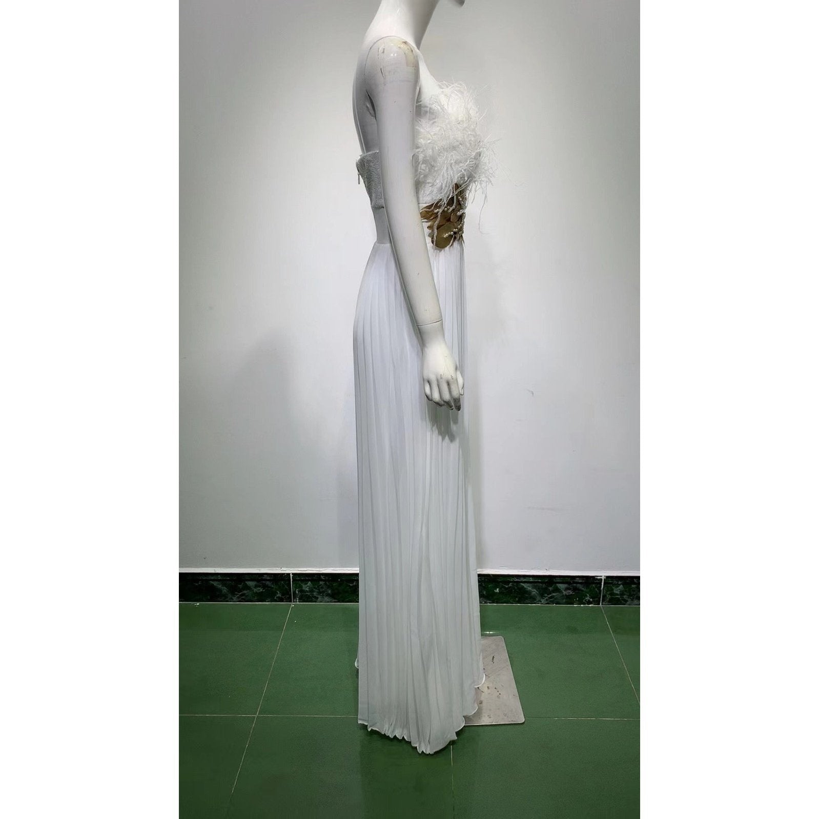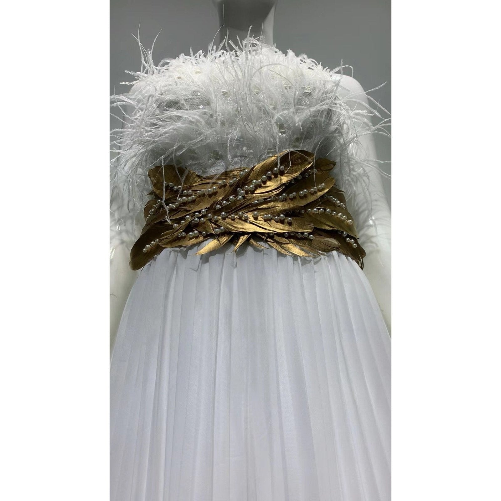 White Strapless Luxury Prom Gown with Gold Beading Belt - Runway-Worthy Celebrity Evening Dress